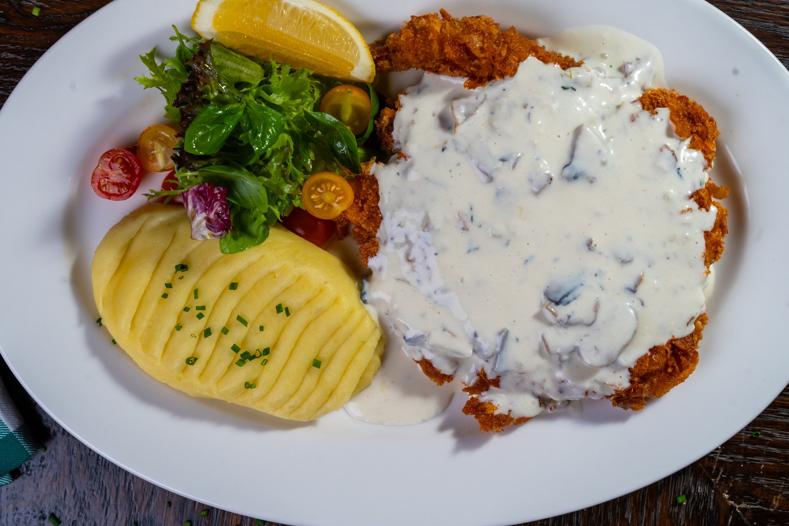 Crispy cornflake-crusted chicken served with creamy mashed potatoes and a fresh side salad. Choose from three indulgent sauces: Parmi-style, Truffle Mushroom, or Three Cheese.