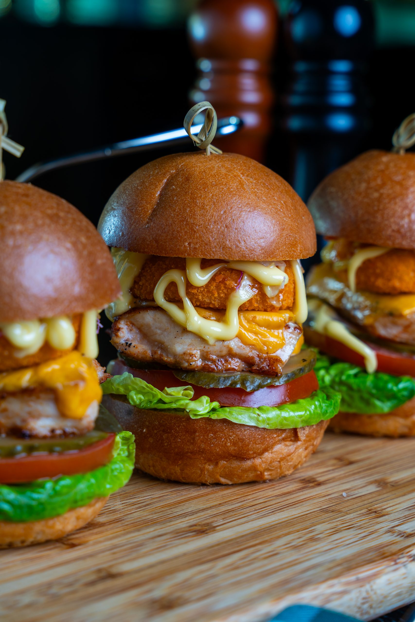 Grilled chicken topped with a crispy chicken ring, fresh slaw, and a kick of sriracha mayo — served as a trio of bold and flavorful sliders.