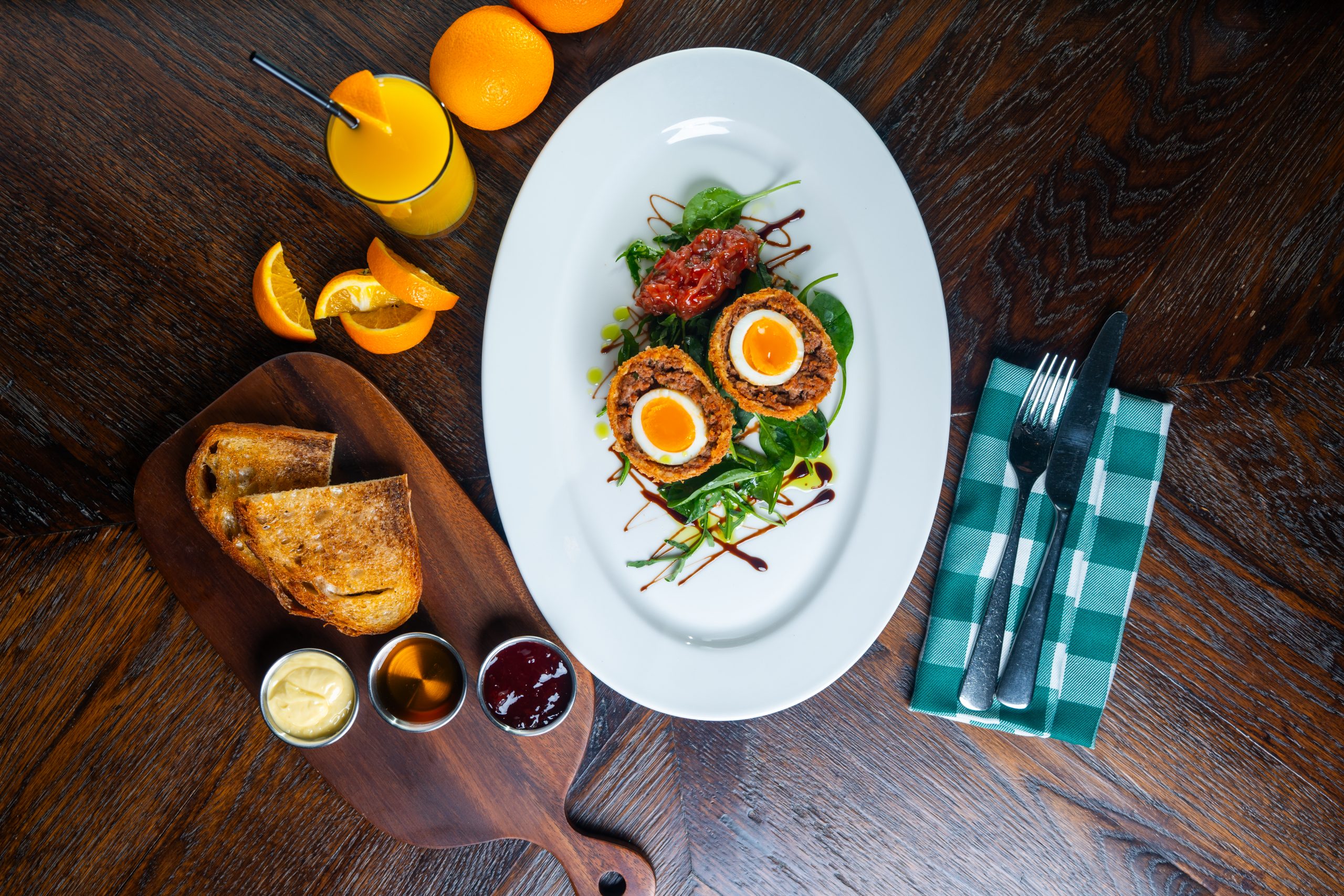 Our breakfast Scotch Egg features a perfectly soft-boiled egg wrapped in seasoned sausage, lightly breadcrumbed and fried, served warm for a hearty start to your day.